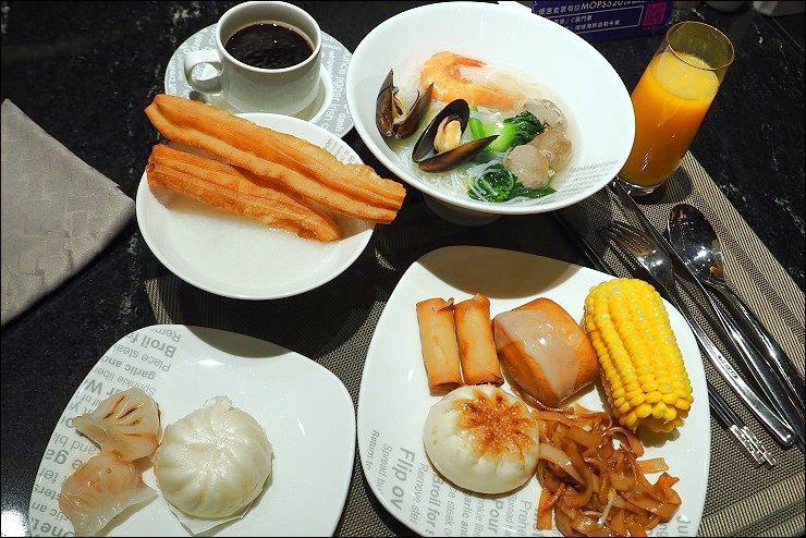 入住二晚的早餐及一天的晚餐都在二樓的「星滙餐廳」享用,「 星滙餐廳」全天候供應自助餐,有早餐、中午及晚餐三個時段。早餐從06:30-10:30(09:30最後進場),自助式早餐餐點超多,有現煮鮮蝦淡菜湯麵、生菜沙拉、燒餅油條、蒸餃、麵包種類十幾種,甜點也很多,自助餐就是會讓人不由自主的拿很多吃超飽。