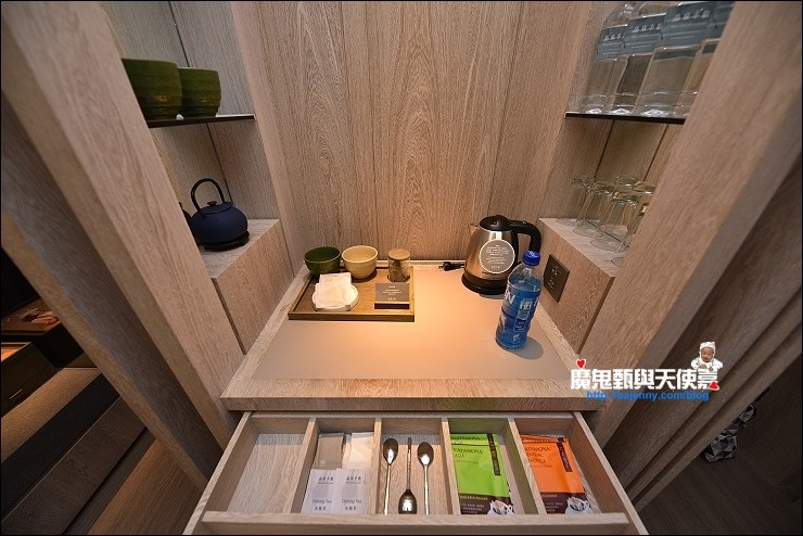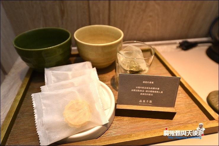 房間備品茶具很有質感,冰箱飲料免費,這次茶點是麻油雞綠豆糕,口味蠻特別的。(※備品為入住時實拍,以飯店實際提供為主※)