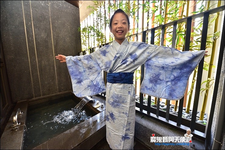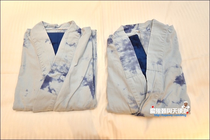 礁溪晶泉丰旅提供的藍染浴衣放在床上還不覺得好看,實際穿起來才讓人眼睛一亮!!!