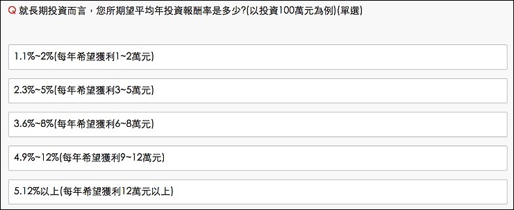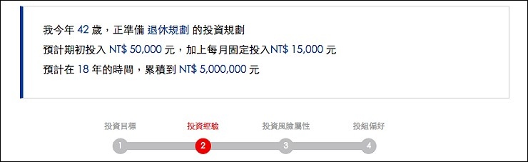 像我這種不懂理財、沒時間研究,更不懂大盤趨勢,怕自己平常把錢花光光,很適合利用投資機器人理財農場來幫忙,只要幾分鐘完成線上問卷,透過個人投資目標、投資經驗、投資風險屬性及投組偏好,就能得到專業的投資規劃。