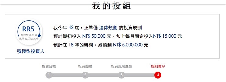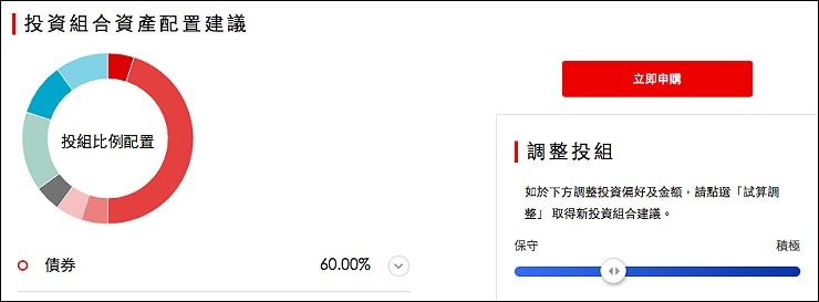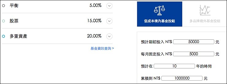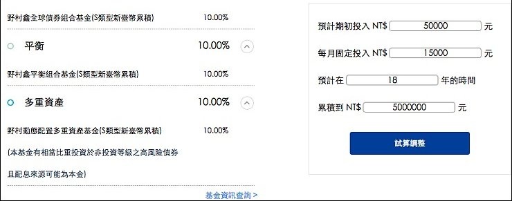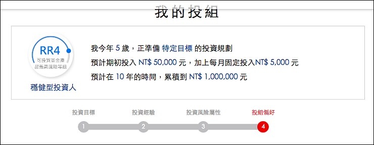 我的想法很簡單,以存一桶金(一百萬)當孩子的教育基金為目標,又不想讓每個月搞的像在繳房貸壓力很大,跟老公討論之後,覺得每個月一人提撥2千五百元給弟弟(少買一件衣服或一雙球鞋就有了),每個月定期定額存五千元,花三分鐘做一次線上問卷,以孩子的角度來存款,就有不同的投資目標、風險屬性及心態,我們從積極型投資人變成穩健型投資人,只願意承受少量之風險,來追求合理之投資報酬率,投組60%是債券型基金、15%才是股票型基金,投組相對保守。每月五千元的小額投資,就能得到股票、債券、平衡基金及多重資產的多元資產配置,要知道,五千元在一般市場上,可能連一支股票都買不起,可能只夠買一檔基金,光是低門檻就能得到專業的投資計劃就讓我想開戶啦。(更多資訊:https://pse.is/EX8FH)