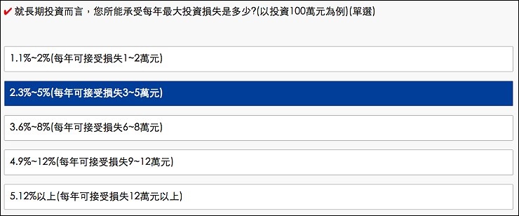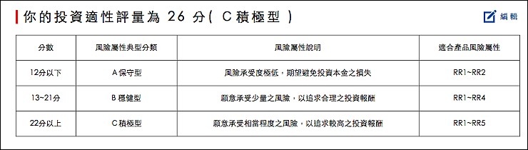投資人一般分為保守型、穩健型及積極型三種,問卷填完判斷我屬於積極型投資人,想有投資高報酬,相對的投資風險也會比較高,我是屬於願意承受一定程度風險,來追求較高的投資報酬的人!
