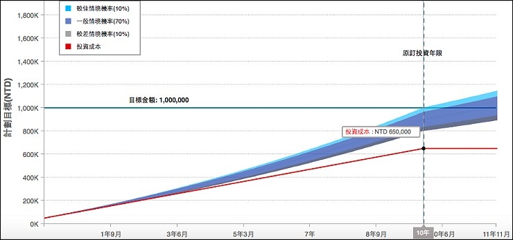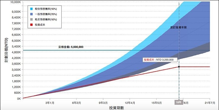 個人專屬的投資組合也有圖示表達,以我的退休養老金計畫來看,每月存一萬五千元,存18年,要累積到五百萬的財富是很有機會的,情境圖表上還顯示,如果景氣狀況好的話,甚至提早到13年就可以完成我的目標,看來交給專業理財機器人,讓我持續朝著設定目標前進,累積財富!未來景氣優於預期有機會上看七百萬元,當然這不是保證穩賺的啦。