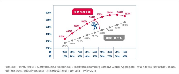 投資不是投入後就一直放著,而是要不定期的去檢視,市場狀態改變或投資比例改變,需要時做適度的調整,但往往一般人都不懂也不會,野村投信機器人理財有自動再平衡的機制,自動再平衡就好比投資的GPS導航系統,確保原先所建議的投資組合黃金比例,不會在投資過程中大幅偏離原先設定的最適路線,當機器人發現我們的投資組合大幅偏離原先設定的比例,就會自動幫我們的投資部位調整回黃金比例,我們不用再花時間管理,交給專業的最好。