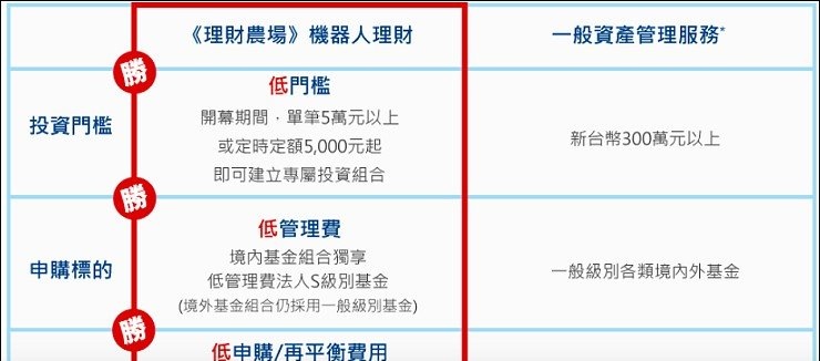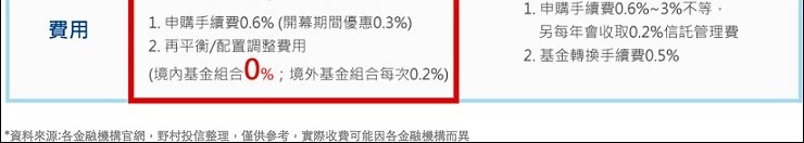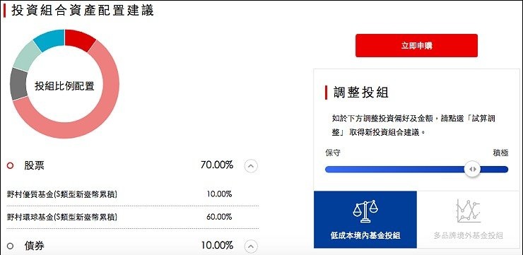 野村投信機器人理財除了上面所說的低門檻就能擁有專屬投組,另外還有二低優勢:低管理費,境內基金組合獨享低管理費法人S-Share級別基金0.99%管理費,及低申購/再平衡費用,申購手續費開幕期間優惠0.3%,境內基金模組的再平衡/配置調整,不須再支付額外費用,三低優勢所省下來的投資成本費用,讓投資績效贏在起跑點!