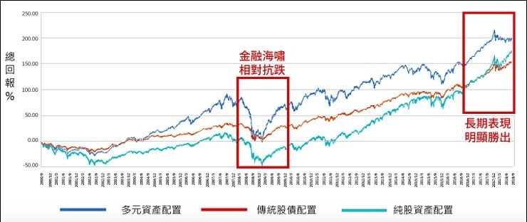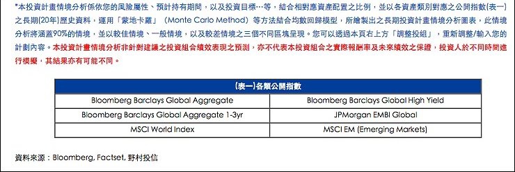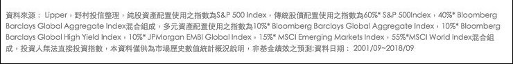 這張走勢圖是透過專業數據資料系統、加上野村投信投資模型整理出來而成,綠線是純股資產配置、紅線為傳統股價配置、藍線為多元資產配置的投資報酬率趨勢圖,長期而言,多元資產配置的報酬率長期表現明顯優於純股資產及傳統股債配置,野村投信理財農場的投資平台上,用大數據所規劃的投資組合,不只有股票和債券的配置,而是依照人田戈個人的需求,建構適合自己的多元資產配置。