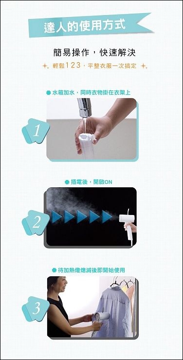 操作簡單:水箱一推就開,電源插上按壓蒸氣鍵即可輕觸移動。