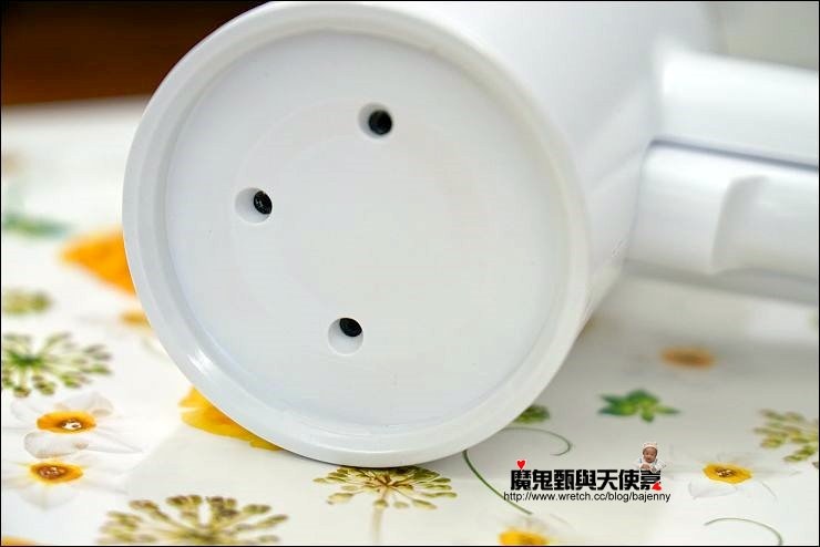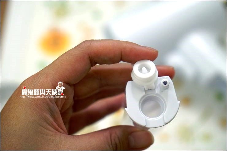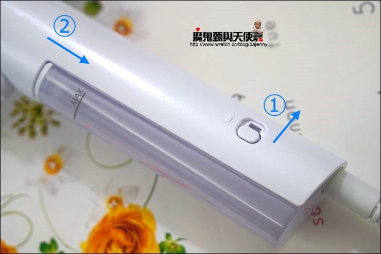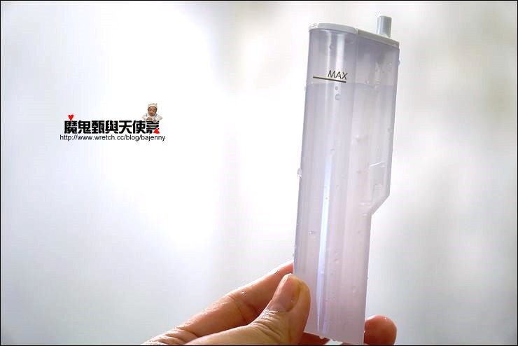 它的水箱安裝在手柄的地方,只要將拆卸鈕往右滑動,同時往下拉出水箱,然後打開注水口蓋加入自來水即可,水箱裝回本體會聽見喀擦聲表示安裝成功。