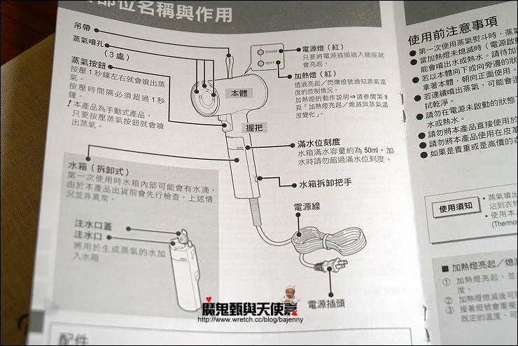 裝水之後插上電源就可以使用啦,此時電源燈跟加熱燈會同時亮起,待加熱燈熄滅後即可按壓蒸氣按鈕使用,此為手動式產品,只要按壓蒸氣按鈕就會噴出蒸氣。