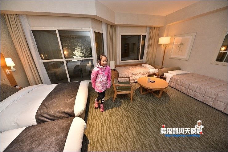 裏磐梯GRANDECO東急飯店的房間寬敞舒適,我們入住的是38平米的房型,共兩張小床,最多可以加兩張床住到四人,小客廳空間超大(要打開兩個29吋行李箱都是小case),因為每天滑雪手套都會溼,後來我們乾脆把手套都攤在地上共八隻也不會踩到XD