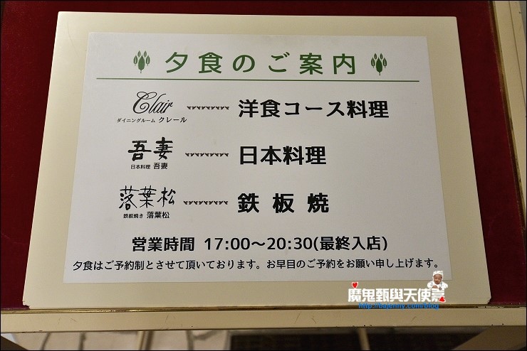 除了房間大又舒服,溫泉夠熱又有露天風呂兩強之外,要來好好介紹飯店的餐點美食!原本很害怕全待在飯店吃三餐(很擔心會吃膩),這裡共有三間餐廳,其中鐵板燒價位較高,要另外加價,飯店住宿附的餐點通常都是和食跟洋食任選,所以我們晚餐各吃了兩次。