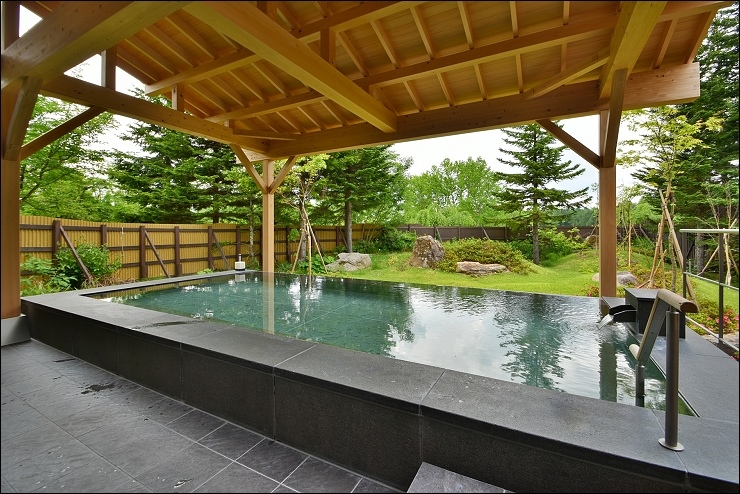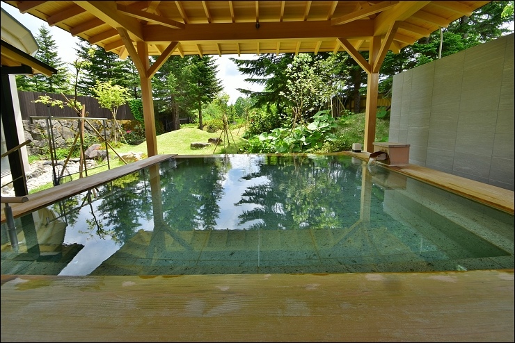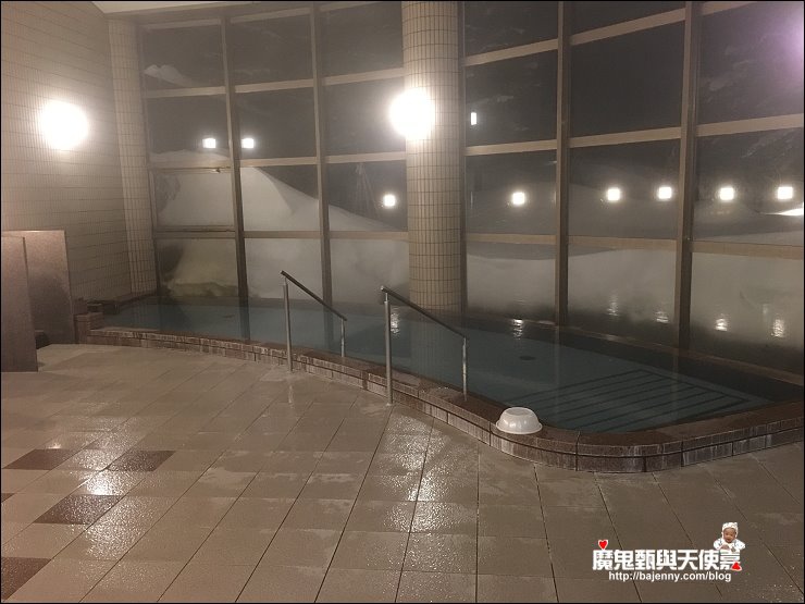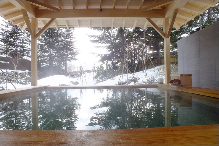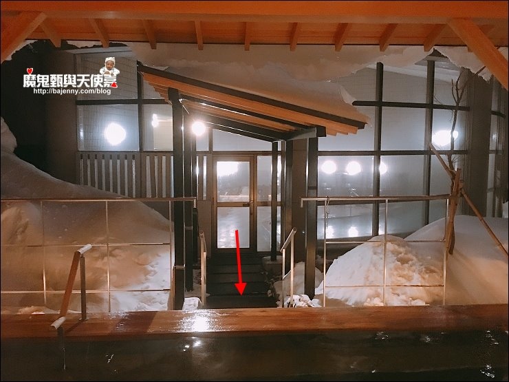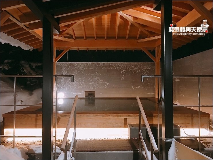 除了達成在冰天雪地泡湯的雙重感受之外,更要稱讚這裡的露天浴池蠻大的!跟飯店要到全景的照片給大家參考。