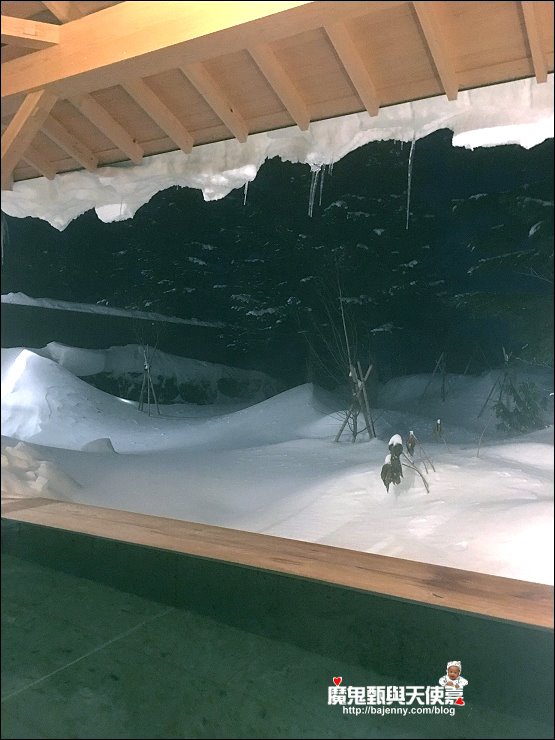 一般露天風呂的水溫都會比較低一點,但這裡調整的溫度很剛好,當身體浸在溫泉、頭部以上接觸到冰冷空氣,上冷下熱這種感覺好奇妙,尤其一旁是雪白世界,妹妹感嘆說出了:「媽媽,我們好像置身在電影景場裡欸』。