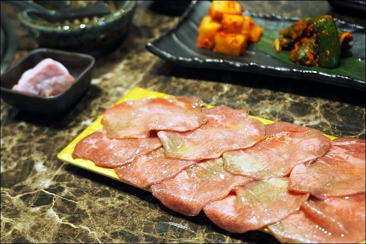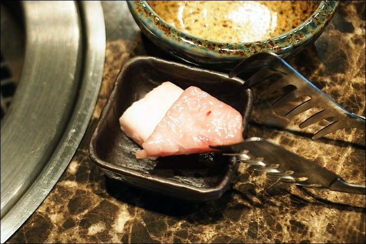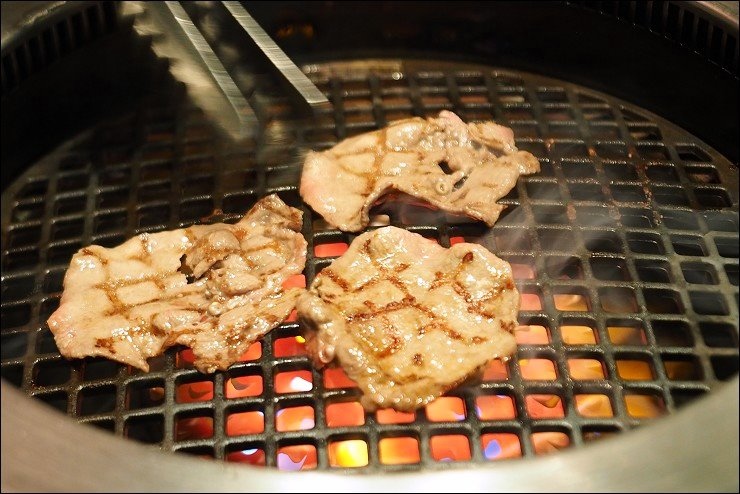 烤肉前先用牛油塊在烤網上刷一遍,這樣烤肉時比較不會沾網,也帶油香。上級牛舌份量不少,一盤有十大片,牛舌薄片放上去不用烤太久就可以翻面,千萬不要烤太久肉會太老偏硬,牛舌口感帶脆,沾點醬汁提味很好吃。