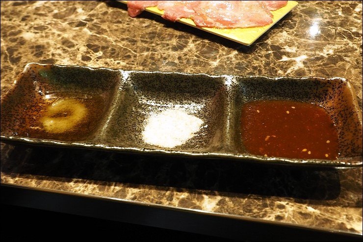 醬料由左到右分別為芝麻油加塩、塩、燒肉醬汁,芝麻油拿來加生菜超香,烤肉我愛沾這裡的燒肉醬汁,味道很棒。