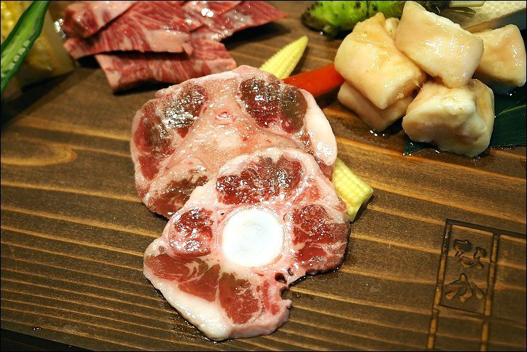 烤牛尾(帶骨牛尾),是店家最推薦的菜色!牛尾湯我吃過幾次,烤牛尾倒是第一次吃到,在燒肉店是少見又特別的菜色!牛尾已去皮,烤後肉質很有嚼勁。右上方是丸腸,牛小腸的部位,它有很多油脂,因為它圓圓的外型,所以被稱為「丸腸」,丸腸烤後脂肪帶有甜味,敢吃肥的朋友可以試試。