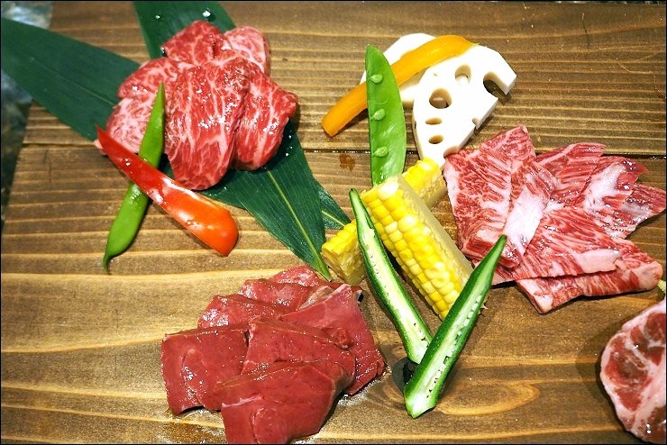 哇~這一大盤牛肉拚盤好豐富,從左到右分別為牛內橫隔膜、牛心、牛外橫隔膜、帶骨牛尾、丸腸,還有不少蔬菜,秋葵、玉米、紅椒、黃椒、玉米筍、豌豆及蓮藕,通通都可以烤來吃,菜色相當豐富。