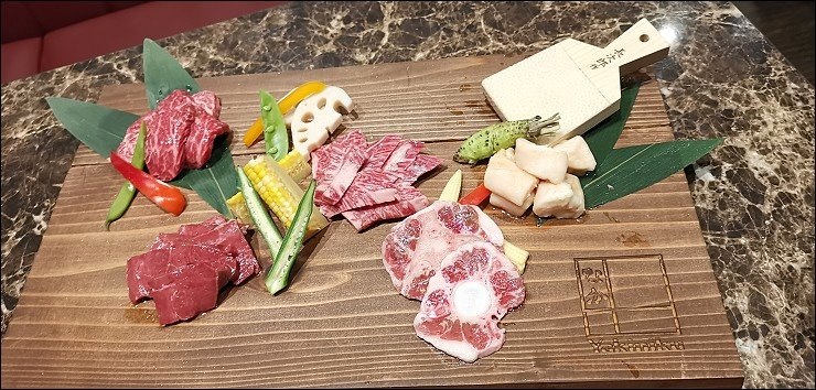 菜單除了有小菜、沙拉、不同部位的牛肉單點、也有三千日圓或五千日圓/1人,二人以上才能點的套餐,三千日圓的菜色有豬肉+牛肉燒肉,附生菜、漬物、白飯及清湯,五千日圓套餐是全牛肉,牛肉等級更高,除了白飯還有牛尾拉麵,生日大餐當然要吃好一點,直接點五千元頂級烤肉套餐,超開心。(對了,店家很快就會有圖文兼具的中文菜單,點餐不怕盲點一通)