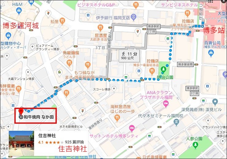 和牛焼肉なか田的地址是福岡縣福岡市博多区住吉2-6-26 2F,最近的地鐵站是博多駅,步行約十來分,附近有住吉神社跟博多運河城可以順遊。