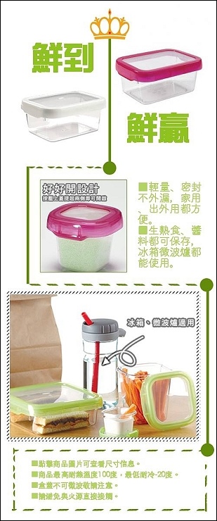 他們家的保鮮盒尺寸很齊全,就連可以裝醬料的小收納盒都有,更有專為嬰幼兒設計的系列!!姐妹說這種小尺寸露營很需要,常常需要裝橄欖油之類的調味料,而且他們家的可以完整密封不漏液,只要按壓上蓋提起兩側即可開啟,Triran材質,可微波及進洗碗機洗滌(但要注意溫度)。