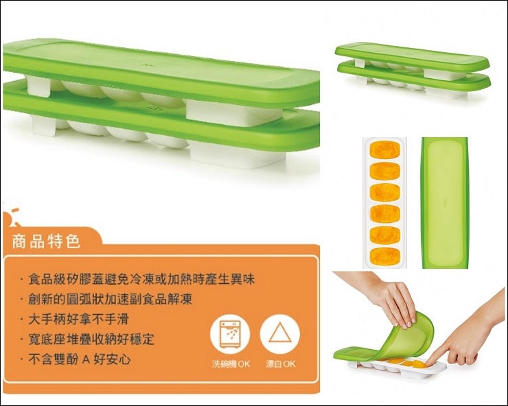 另外寶寶系列的尺寸跟數量的設計係為了妥善保存副食品作準備,像一次四格,是為了讓媽媽好儲放副食品,托盤還可直接層疊放置冷凍庫中,不含雙酚A。