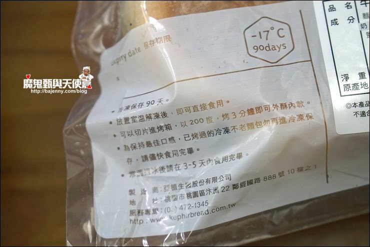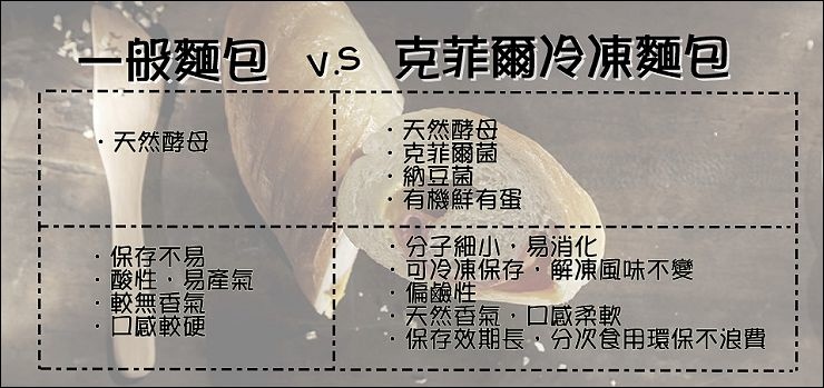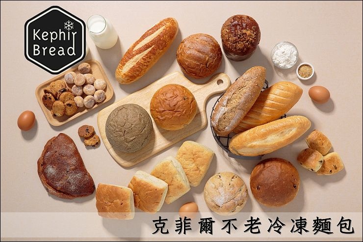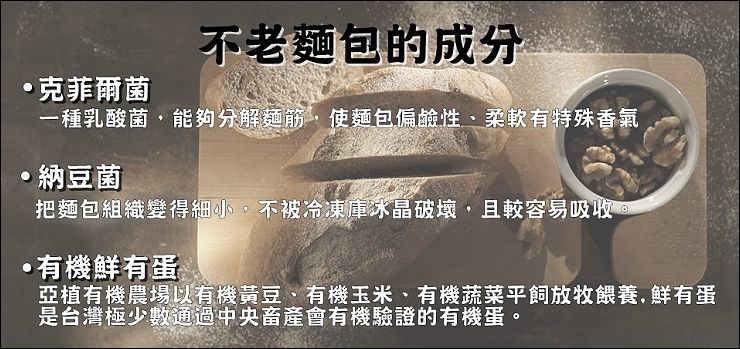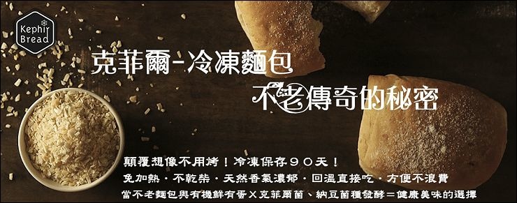 克菲爾的不老麵包在出爐後放涼包裝就進入冷凍庫冷凍保存,保存最多可以長達九十天(請參照製造日期計算),要吃的時候只需要室溫退冰,可以不用烤箱!不用微波!退冰即食!由於使用天然酵母、克菲爾菌、納豆菌以及有機鮮有蛋,其中的克菲爾菌能讓麵包變為偏鹼,所以吃多也比較不擔心胃部負擔太大,而且還可以增添麵包香氣。