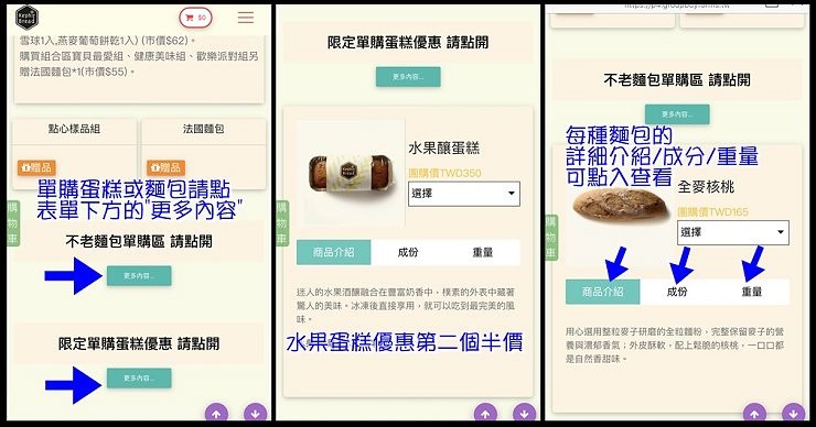 表單最下方也有單購區,跟水果蛋糕(第二件半價!)優惠區,想加購單品可以從這邊買~單品選購買千也贈法國麵包喔!