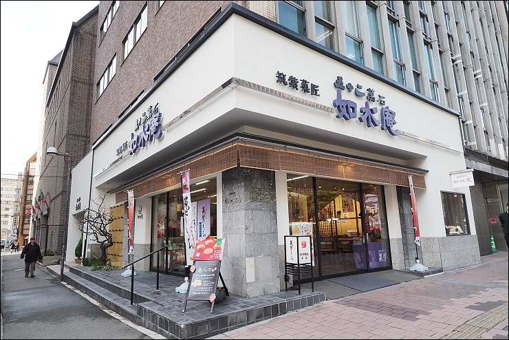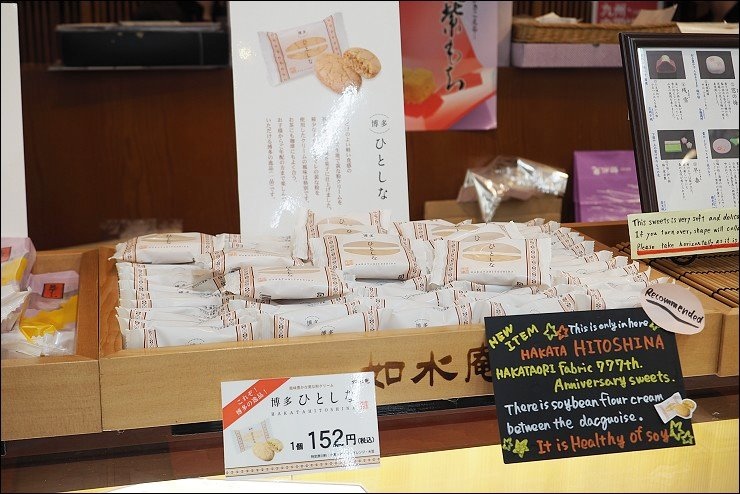 如水庵全名是「五十二萬石如水庵」,本店在博多車站博多口出口往日航飯店方向走,約三分鐘就到,地點相當方便,在博多車站、福岡機場也都有買得到如水庵,吃不夠可以再補幾盒回家,不過本店商品品項最齊全,來福岡大都有機會來到博多車站換車或逛逛,甚至是住博多車站附近,走個三分鐘來本店逛逛。