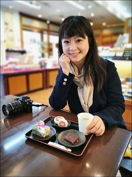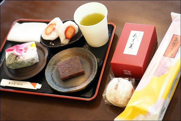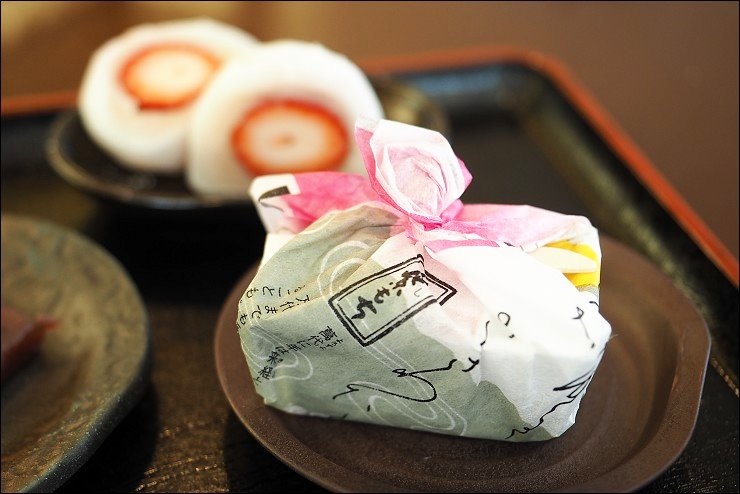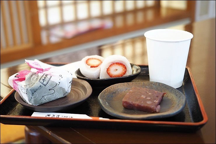 我們先拿幾樣小包裝及單顆大福去結帳,跟店家說我們要在店內吃,店家就會幫我們擺盤並附免費熱茶,很貼心的服務!