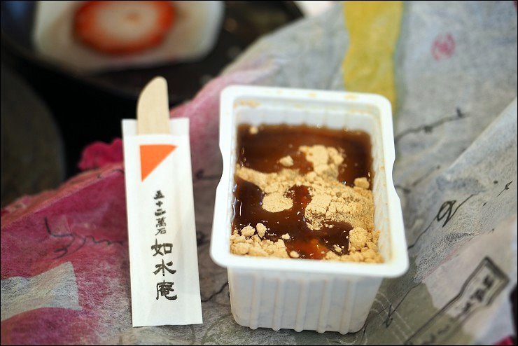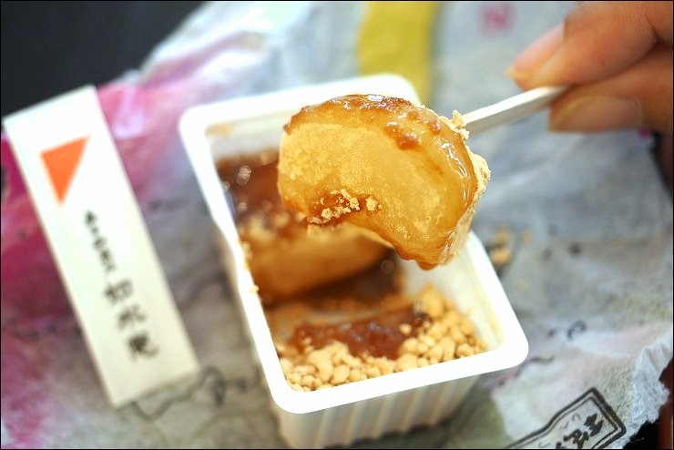一打開黃豆香氣馬上衝出來,超香的,可以先吃原味的,它看起來跟蕨餅很像,但卻不是蕨餅而是麻糬,它是主原料是使用糯米製成,Q度很夠,再配上高級大豆製成的黃豆粉,非常好吃,第二吃就是要加入黑砂糖蜜,沾滿黑糖跟黃豆的麻糬更是一絕,Q彈的麻糬甜而不膩,難怪年年得獎,更是店家熱賣商品!