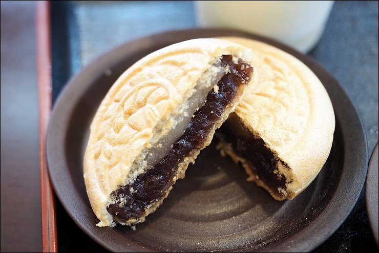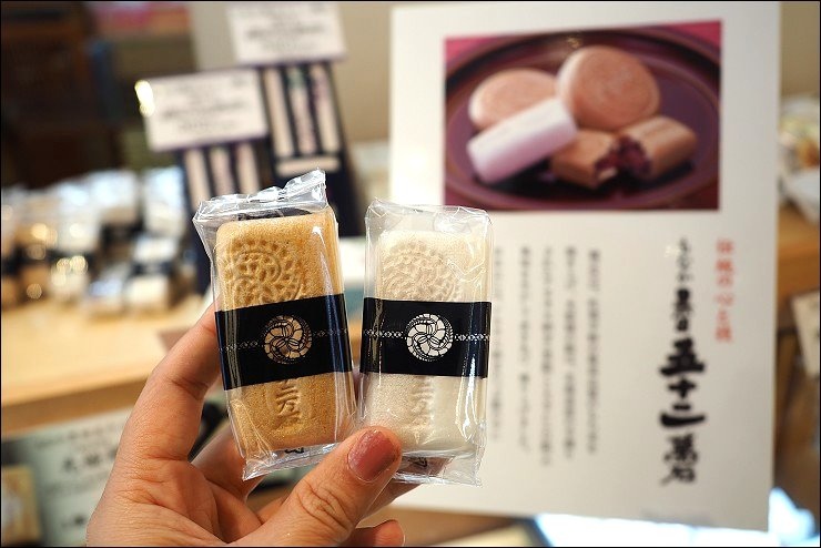 第一輪吃的有滿意,再去結帳吃不同口味的和菓子,傳統長型的「最中」稱為「光姬樣」(是黑田如水妻子的名字),有紅豆黑餡及白餡二款;圓型的最中是印有黑田家紋的「如水公」,是紅豆餡加上麻糬,口感QQ的,紅豆餡又綿又甜,很日本甜點的口味,適合配無糖熱茶。