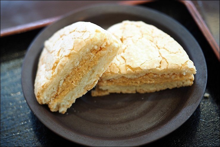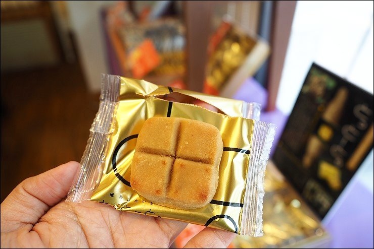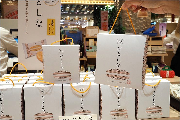 這款博多「ひとしな」漢字是「一品」帶有「逸品」的意思,看似平凡的外表下,吃下去卻讓我驚艷,外酥內軟帶有彈性的蛋糕,裡頭的黃豆粉夾心恰到好處,完全不甜膩,有點像高級的法式馬卡龍的口感,亦或著像台版馬卡龍麵包店的小西點,這款我稱它為精緻美味加量版日式馬卡龍,吃完立馬再去抓一籃零賣的自己吃,盒裝的買回家送親友,家人吃了很滿意,這款商品中譯稱為「博多一品」當之無愧。