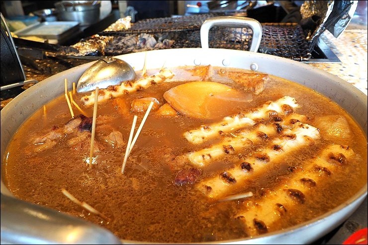 很快塊我們點的菜就擺滿桌啦!關東煮趁熱吃才好吃,蒲燒雞肉(1隻/290日圓)醬汁淋的不少,不過可能烤的時間不夠久,我覺得醬汁只是淋在上面,反而沒有入味到雞肉裡,有點可惜。
