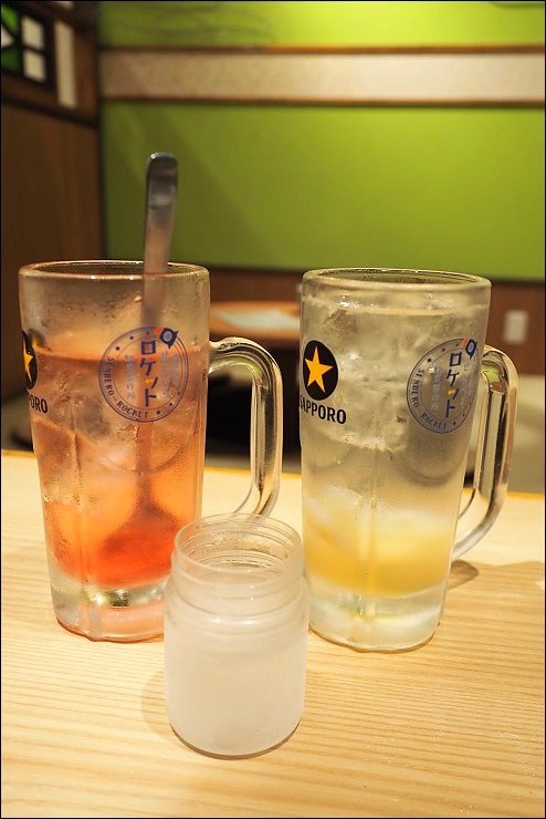 吧檯內一大鍋水炊火鍋高湯的關東煮,看起來好美味~~有不少菜色,水炊雞肉高湯關東煮,有白蘿蔔、竹輸、天婦羅、魚板包餃子、牛筋(日本和牛)、爌肉,金額在130~200日圓不等。我們點了一份牛筋、魚板包餃子、控肉,牛筋挺好吃的,魚板包餃子份量也不小,關東煮一個一百多塊,價格很划算。