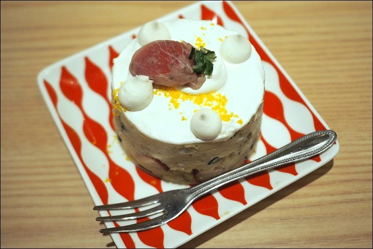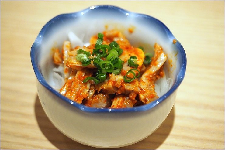 店家推薦馬鈴薯沙拉(490日圓)及跟自豪的自家製醃漬鱈魚腸佐豬內臟(390日圓)。馬鈴薯沙拉看起來像是一份甜點蛋糕,切開有金黃蛋液流出,裡頭竟然藏著半熟蛋,沙拉口感很綿密,吃起來滿清爽的。自家製醃漬鱈魚腸佐豬內臟(390日圓)我跟友人大讚,它辣度十足,豬內臟口感很有嚼勁,真是道下酒好菜,敢吃辣的朋友一定要吃看看。