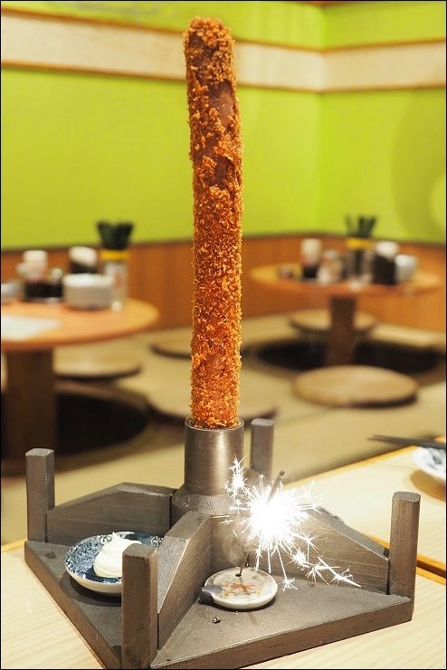 炸魚肉火箭(590日圓),長長一根炸物上桌,點上仙女棒猶如蓄勢待發的火箭,視覺效果十足!