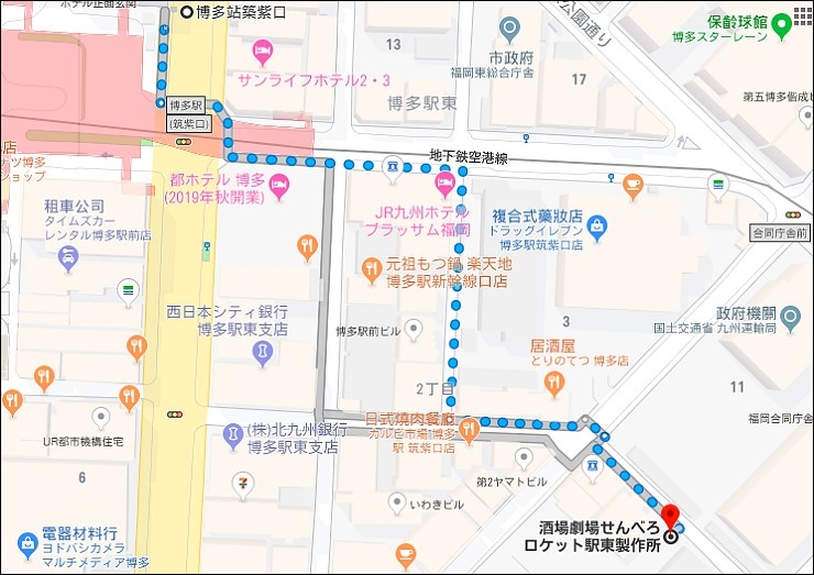酒場劇場せんべろロケット駅東製作所地點是福岡県福岡市博多区博多駅東2-10-18 ホテルフラトン福岡博多1F,從博多站筑紫口步行約5分鐘,面向JFA。旁邊是2018年8月底新開幕的HULRTON飯店,地點很便利。