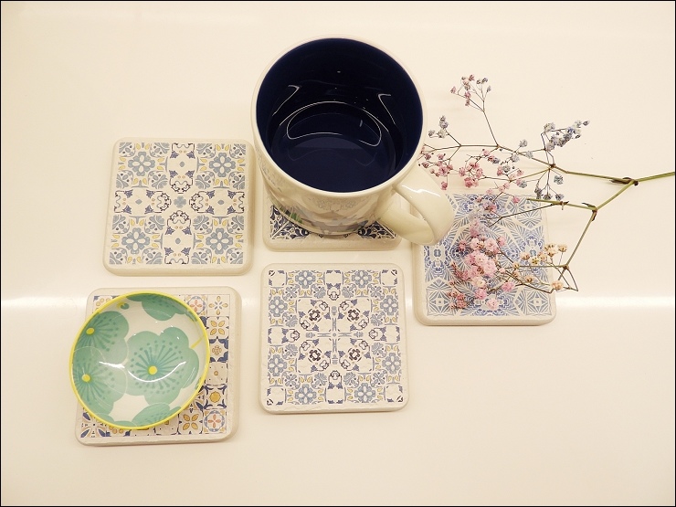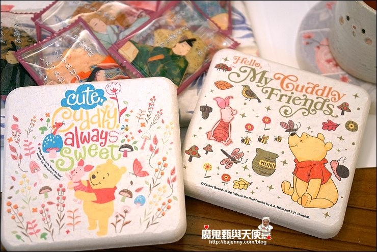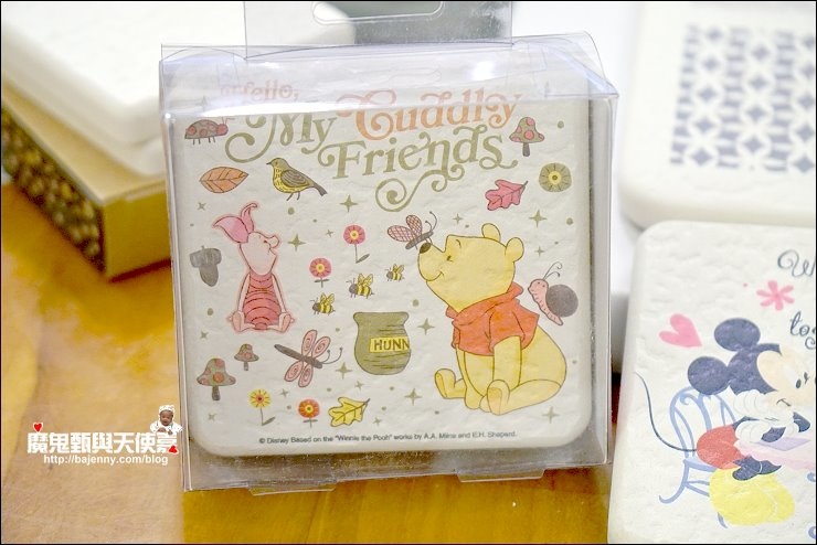 只有迪士尼杯墊可以單購,其他都是一組五入盒裝喔,然後除了茶墊禮盒裡的杯墊是圓形,其他都是方型圓角設計。