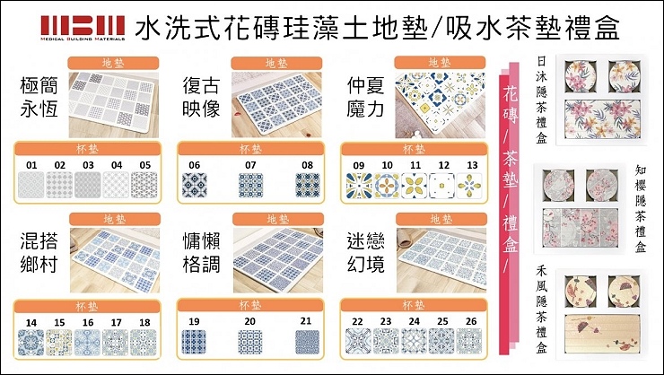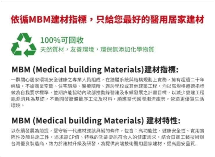 MBM ( Medical building Materials ),以永續發展為前提,堅守新一代建材應該具備的條件, 包含:高功能性、健康安全性、實用實際性及簡易施工性,追求高CP值、特殊的功能要能符合人的健康需求, 結合日商工藝技術與台灣優良製造商,致力於建材升級及研發,為提供高端技術醫用居家建材,提高居安品質。