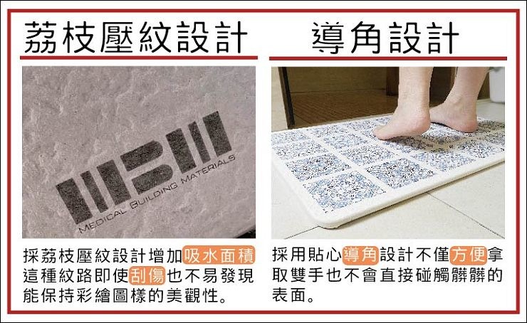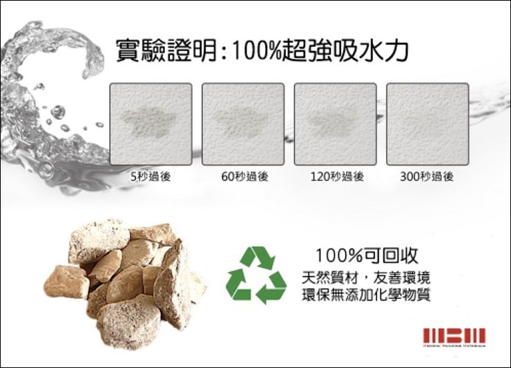 另外MBM的珪藻土係採荔枝壓紋設計來增加吸水面積,這種紋路即使刮傷也不易發現,能保持彩繪圖樣的美觀性,順便附上抑菌及不含石棉的檢測報告,貼心的導角設計也方便使用者從地面將地墊拿起。