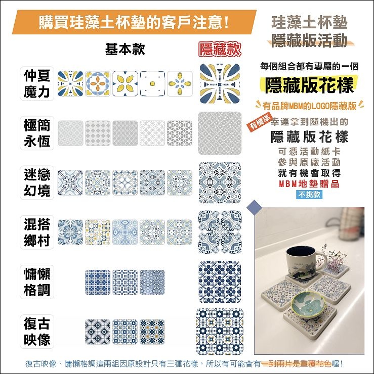 杯墊共有六個組合,每個組合都有專屬的一個隱藏版花樣(有品牌MBM的LOGO隱藏版),