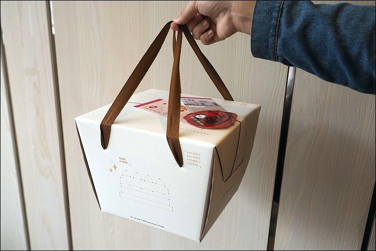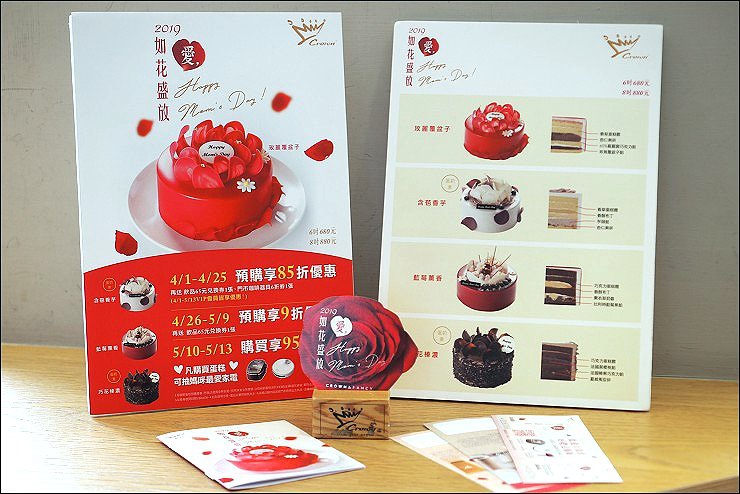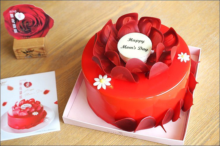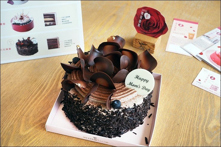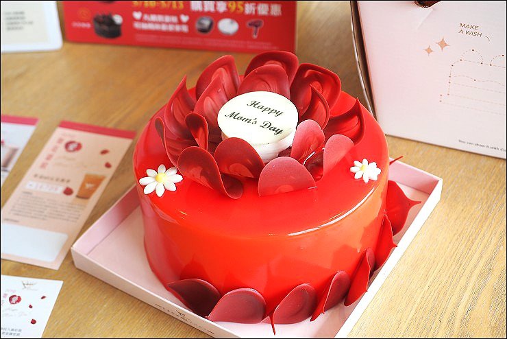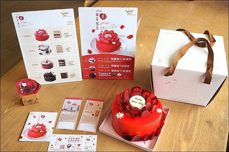 裝蛋糕使用的紙盒式提袋也很大方,拆開時感覺很像在拆禮物,附贈飲品65元兌換券1張以及摸彩券1張,還有一張玫瑰卡片,可以把不敢說出口的甜言蜜語寫給媽媽。