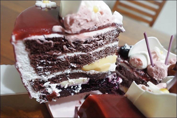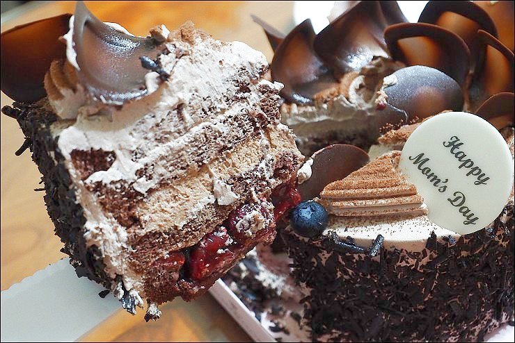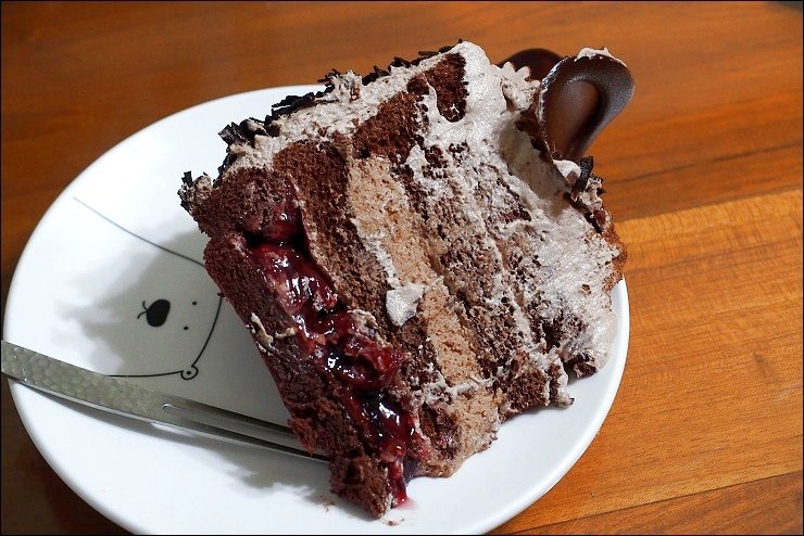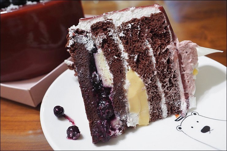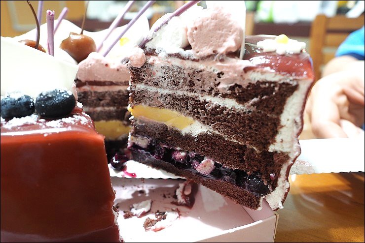 大眾款的黑森林巧克力是我家生日蛋糕常輪到的口味之一,這款家人評價也不錯,巧克力蛋糕不會乾也不會太溼,吃起來滑順綿密,配上法國榛果巧克力餡很香很滑順,碎碎的夏威夷豆增加口感,我個人喜歡黑櫻桃餡,吃的到滿大塊的黑櫻桃果粒,滿滿的香濃巧克力非常純,不過小朋友覺得巧克力有點苦不夠甜,媽媽我就愛甜度不高的苦甜巧克力!而正在控制體重的二嫂說,上層的鮮奶油跟內層的巧克力奶油吃起來多了些,有些人吃蛋糕都會把鮮奶油挑掉,實在可惜,巧克力奶油餡及鮮奶油滑順口感我好愛。