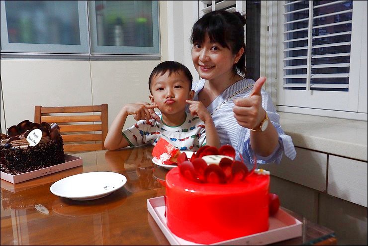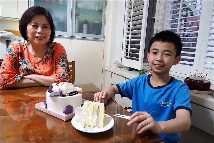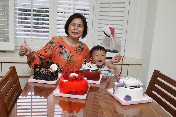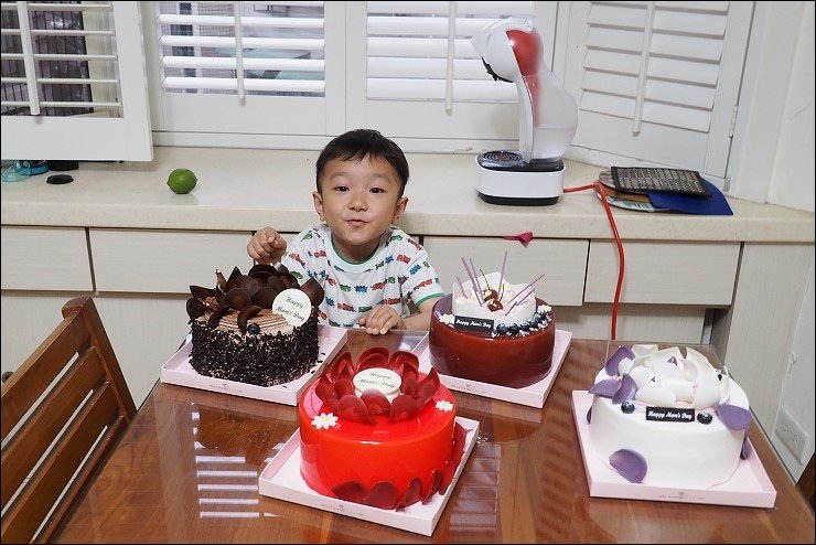 養兒方知父母恩,我從當了媽之後才知道爸爸媽媽真的很偉大~~在學習當媽媽及養育孩子的過程中,體會到爸媽的辛苦,嫁人生子後的我更珍惜家人,超愛回娘家當媽的女兒~媽媽的愛總是滿滿的!這次收到金鑛咖啡的邀請,試吃母親節蛋糕,讓我借花獻佛帶了四顆漂亮又可口的蛋糕回娘家孝敬媽媽,提早慶祝母親節,三代同堂好歡樂~金鑛咖啡今年母親節推出四款蛋糕都好美哦,像朵盛開的玫瑰的「玫麗覆盆子」超漂亮,口味一級棒的芋頭布丁得票率最高,阿弟父子組喜歡「巧花榛濃」有濃濃的巧克力,搭配黑櫻桃餡及夏威夷豆,口感香濃滑順,「藍莓薰香」像是美麗的珠寶盒,巧克力蛋糕配上布丁及藍莓果餡及薰衣草奶醬,允瑄姐姐投它一票,四款蛋糕各有特色!