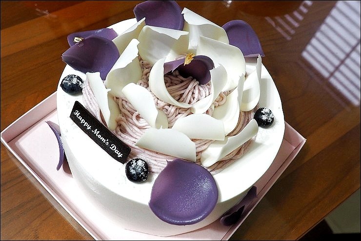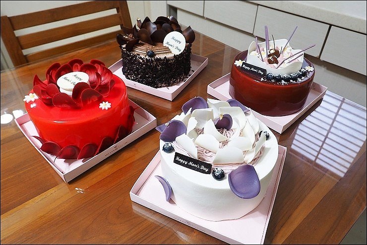 金鑛咖啡母親節蛋糕有玫麗覆盆子、含苞香芋、藍莓薰香及巧花榛濃四款,各有6吋680元及8吋880元的選擇,人口少訂6吋就夠吃,大家庭人口多可以訂8吋。