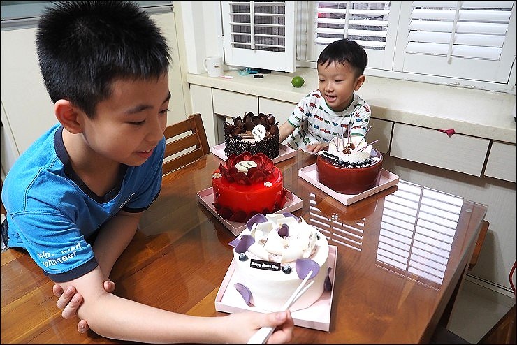 這回外帶金鑛母親節限定蛋糕四款回家,阿嬤、嫂嫂跟我三個媽媽,外加五個小朋友一起來分食試吃這些蛋糕,口味清爽細膩人氣第一是「含苞香芋」,巧花榛濃是香濃的黑森林巧克力蛋糕,外型漂亮迷人的「玫麗覆盆子」與「藍莓薰香」是花果香的酸甜美妙好滋味,母親節記得回家陪陪媽媽哦,預祝辛苦的媽媽們母親節快樂!!