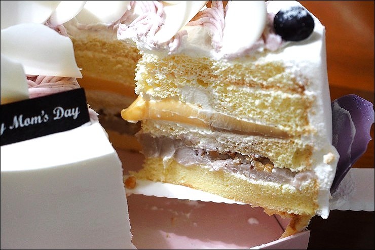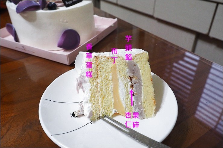 不得不說芋頭跟布丁超搭的,百吃不膩!香草蛋糕搭配甜甜的布丁及香濃的芋泥,芋泥鬆軟綿密好好吃,我們家小朋友狂攻這顆,就算晚餐才剛吃飽,這顆芋頭布丁上桌照樣秒殺,邊吃邊稱讚,好吃又不甜膩,鮮奶油不會太多也不會太甜,與香草蛋糕一起入口剛剛好,杏仁果碎讓蛋糕有堅果香,得票率最高,大推!