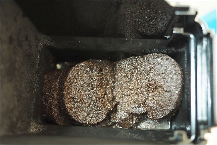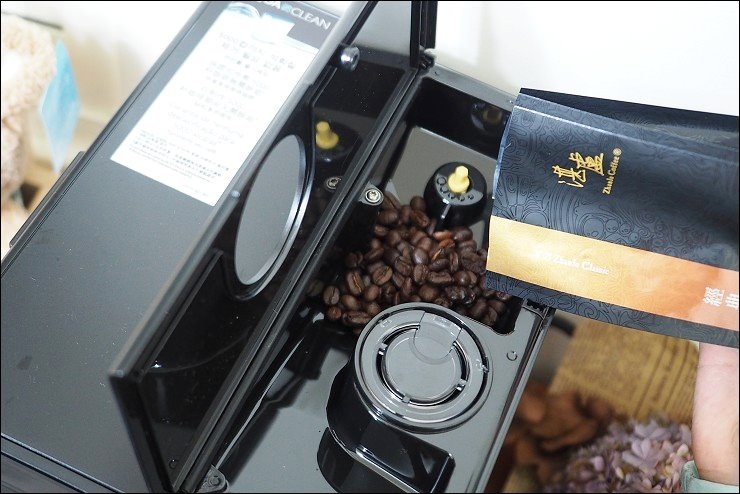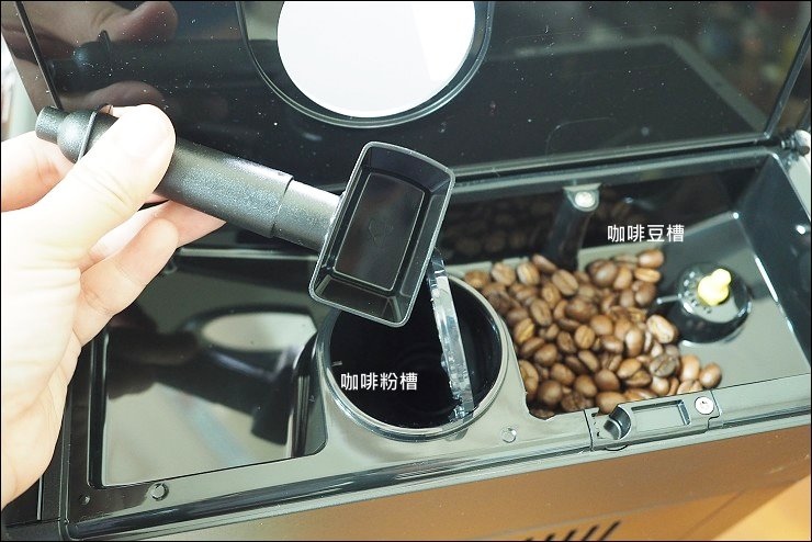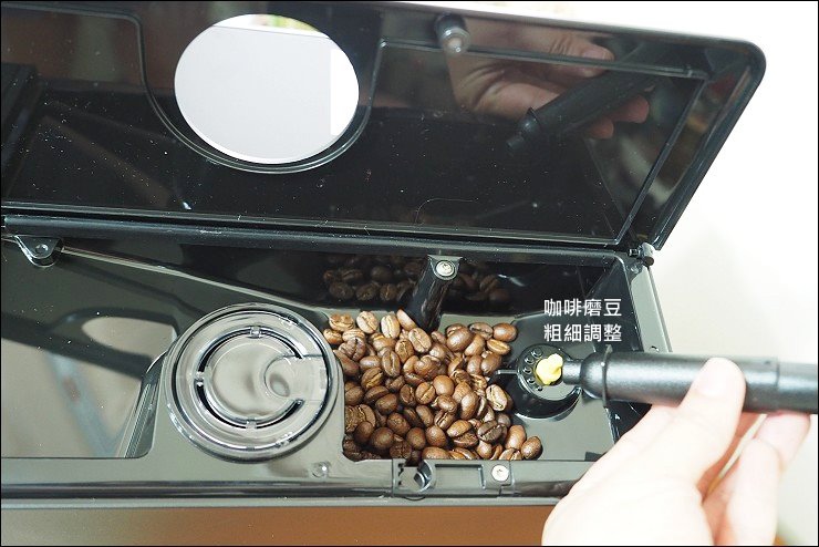 咖啡機上方有咖啡槽,可以放咖啡豆或是放事先磨好的咖啡粉在咖啡粉槽裡,用咖啡機附的咖啡匙,咖啡粉一平匙煮一杯,咖啡豆槽旁也有可以調整咖啡研磨粗細的地方,共五段式研磨,微調咖啡口感,視個人喜好來調整。