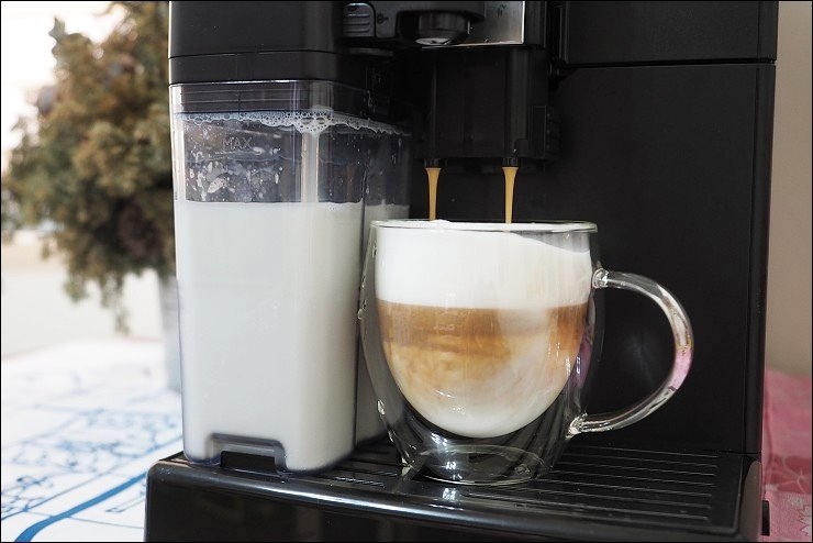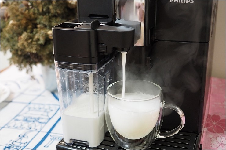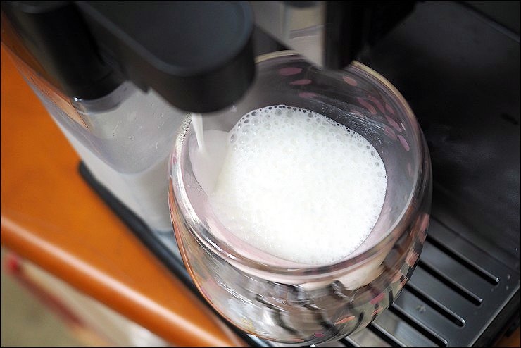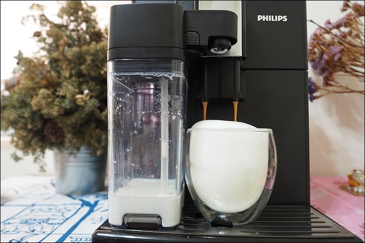拿鐵也是一鍵完成,專利鮮奶壺,自動製作奶泡好方便,全自動義式咖啡機會先自動出熱牛奶,奶泡也一併打好注入杯中,接著才注入咖啡。
