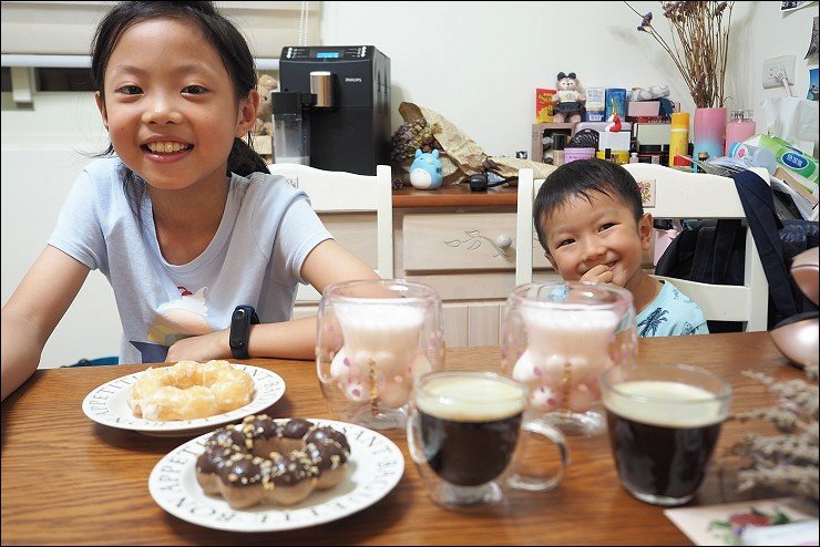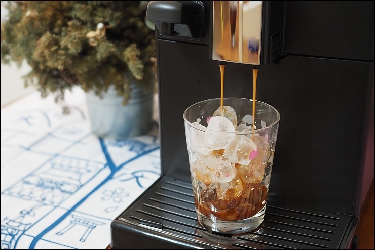 然後天氣開始熱啦,杯子裡放些冰塊,冰美式也是一分鐘就到手,超級方便,不用出門到便利商店買(難怪我都宅在家...),自從這台咖啡進駐家裡,家裡變成高級咖啡廳,要吃早午餐、或是下午茶都有香濃好喝的咖啡,所以阿弟爸對這台全自動咖啡機評價很高。